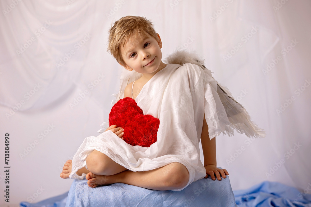 Little cupid toddle boy, holding bow and arrow, beautiful blond cherub