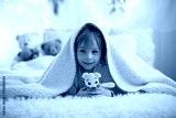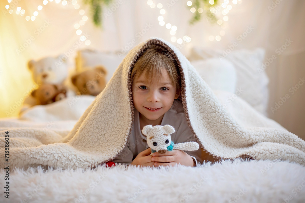 Little cute preschool boy, holding cute teddy bear, hiding under blanketl, playing at home in bedroom