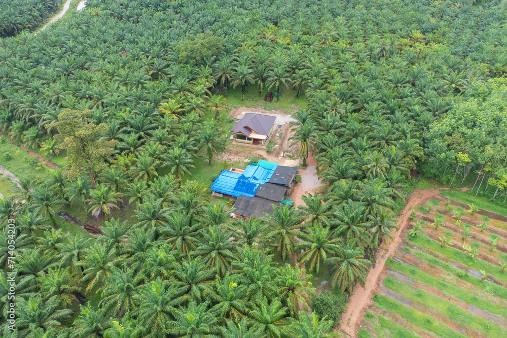 Aerial top view of a small house in lush green trees from above in tropical forest in national park in summer season. Natural landscape. Pattern texture background.