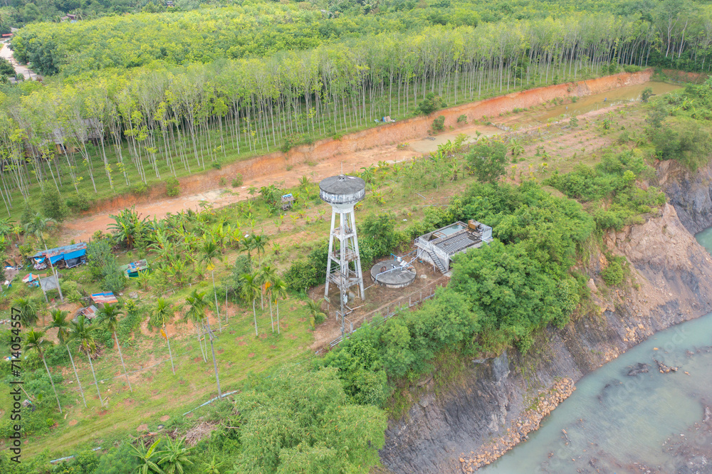 Aerial top view of village water supply with lake or river for agriculture. Nature landscape background. Plumbing tank utility.