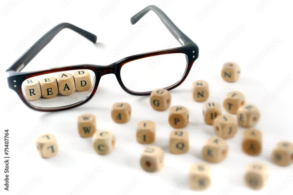 glasses and read message written in wooden blocks, isolated on w