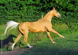 Two golden akhal-teke breed horses running in the park together. Beautiful horses