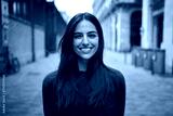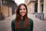 Close up portrait joyful beautiful young Caucasian gen z woman happy smiling on city street. Female people with nice expression looking at camera in open air. Spanish girl posing for picture outdoor