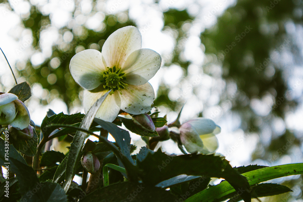 Helleborus Foetidus green buttercup, frost wild flowers grow in spring garden. A primary white flowers cluster in bloom. Springtime nature awaking.