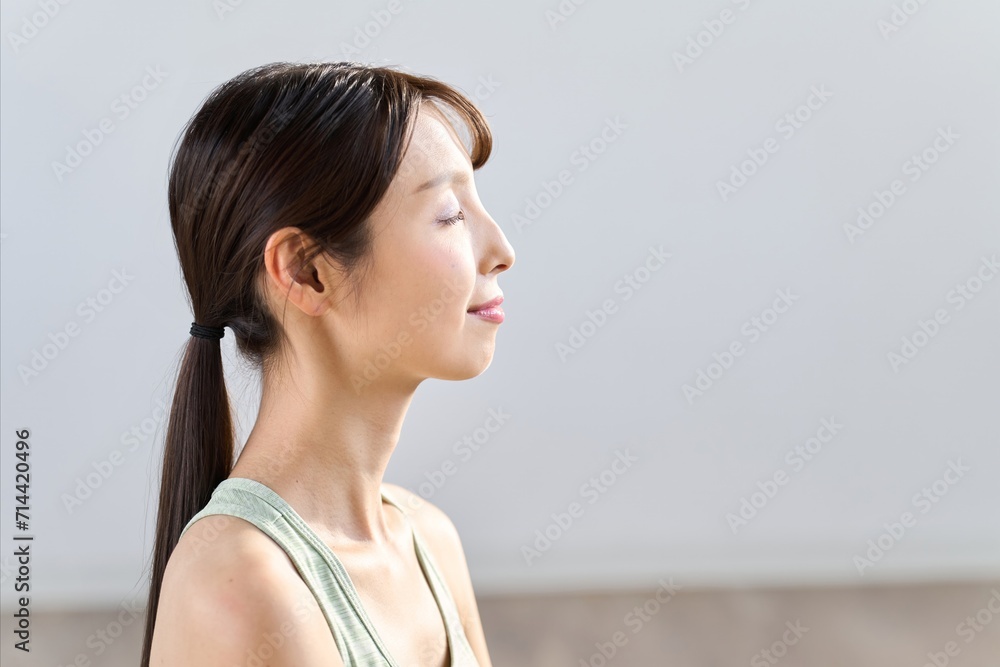 自宅で目を閉じて瞑想する女性