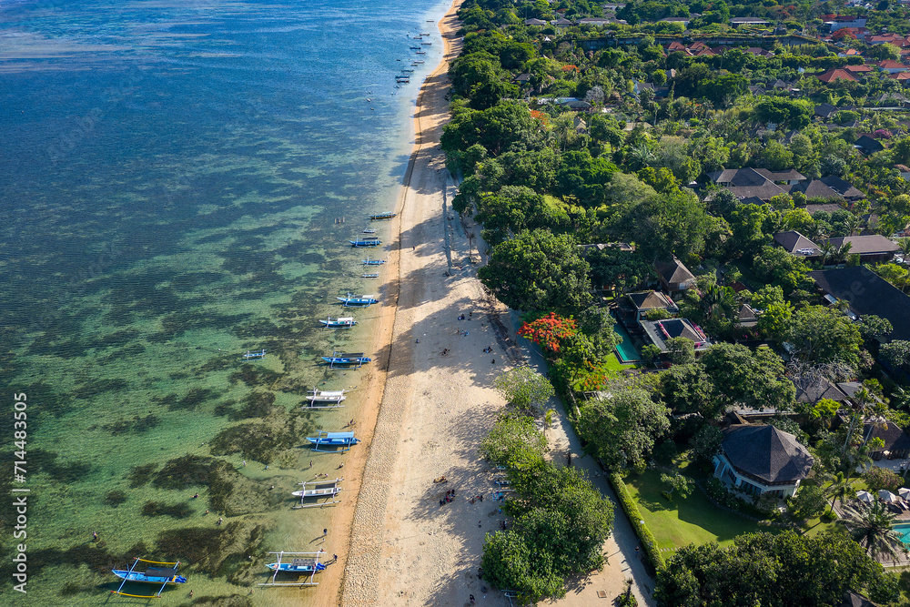 Overhead view of traditional boats moored off a tropical beach with fringing coral reef in Sanur