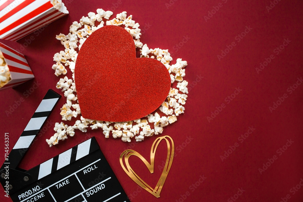 A banner for the film industry. A romantic movie date. A movie camera, 3D glasses, popcorn and a popcorn heart on a red background. The film will premiere on Valentine's Day.