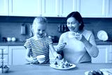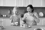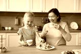 Cheerful granddaughter girl and grandma eating homemade sandwiches in kitchen together, laughing, drinking hot beverage, tea, cocoa, laughing, talking, having breakfast, lunch