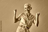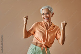 Portrait of a modern woman wearing an orange t-shirt and green pants of pastel shades who is emotionally happy showing a win and victory gesture by raising her hands up and laughing.