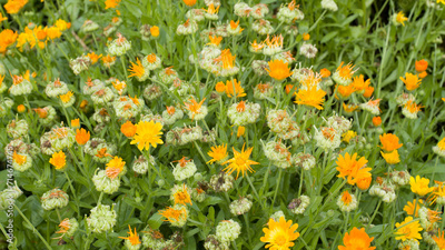 Group of calendula flowers and faded flower heads with calendula seeds.