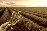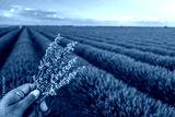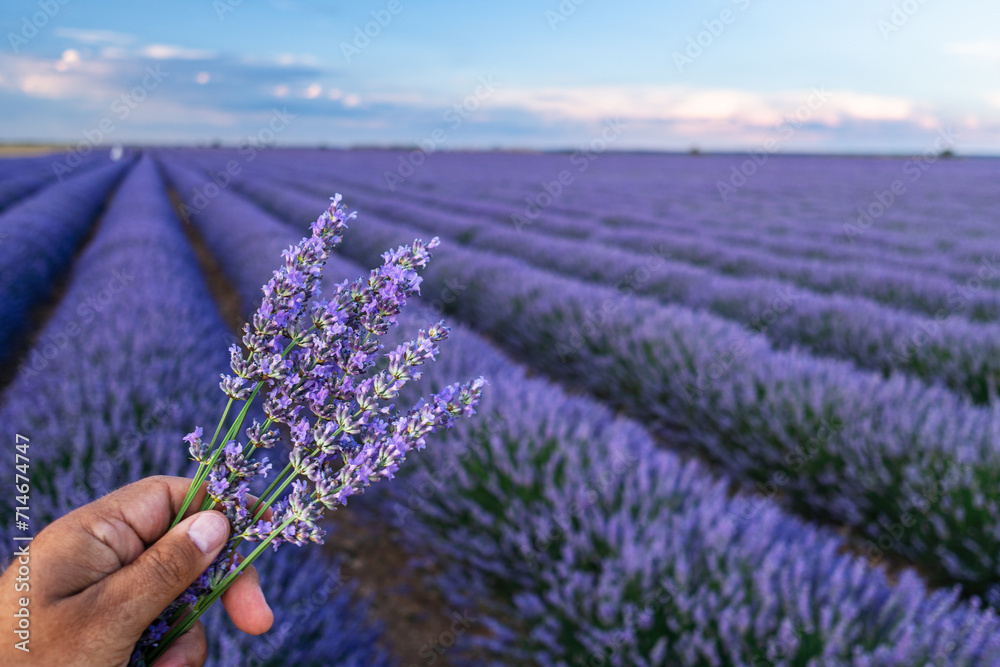 Bouquet of lavender in the hand and lavender field in blossom at the background.