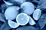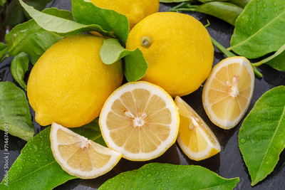 Ripe lemon fruits with slices and lemon leaves on a gray stone table.