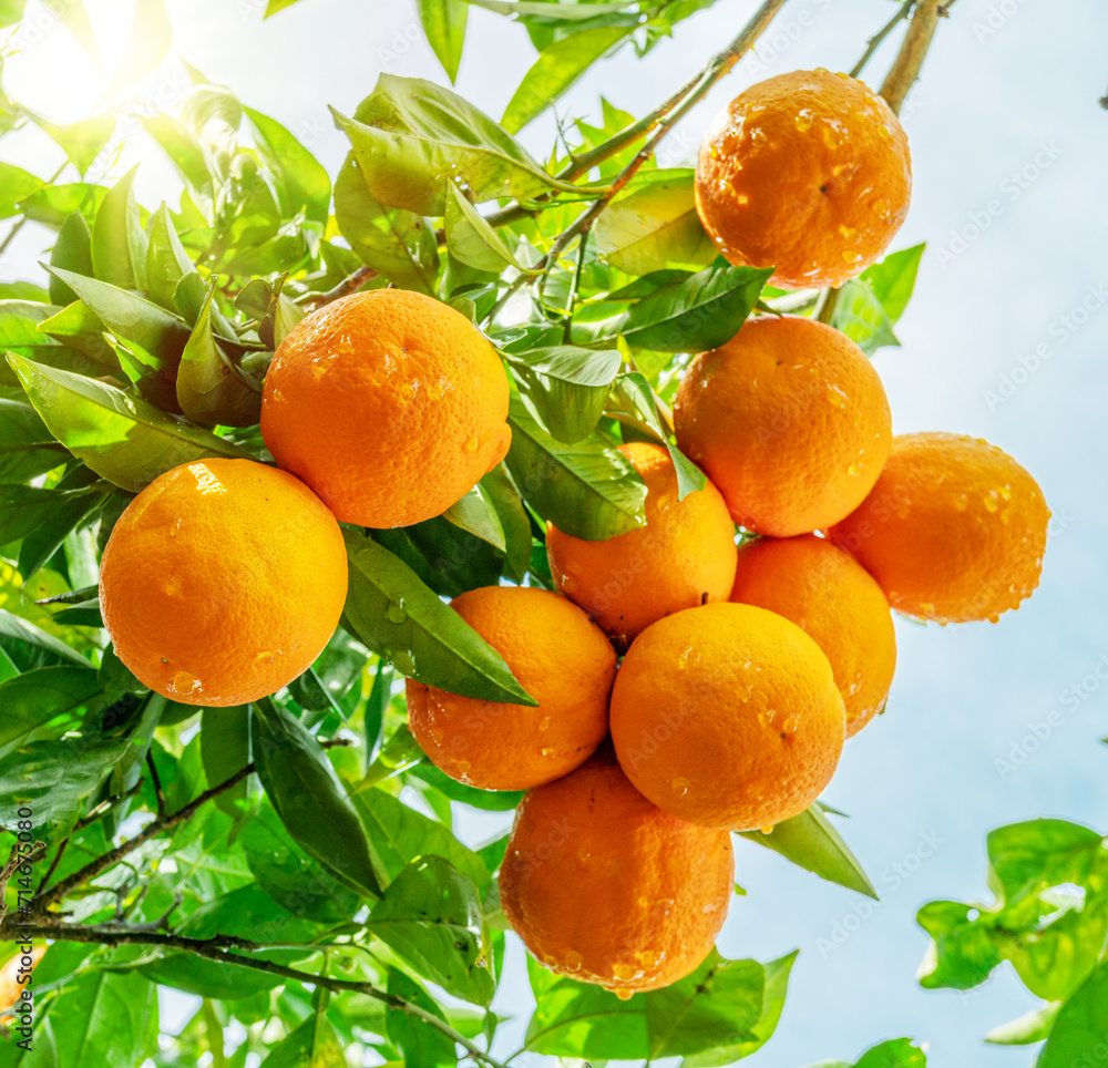 Ripe orange fruits on orange tree between lush foliage. View from below. Close-up.