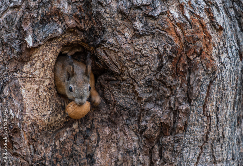 A squirrel with a nut is sitting in a hollow tree in the forest.
