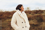 Beautiful young brunette swarthy woman in white coat in nature in fall, winter cold day. Female smile, happiness, well-being. Happy girl outdoors.