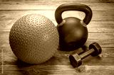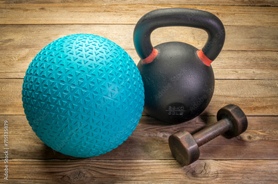 heavy rubber slam ball filled with sand, iron kettlebell and a small dumbbell on a rustic wood background, training, exercise and fitness concept