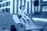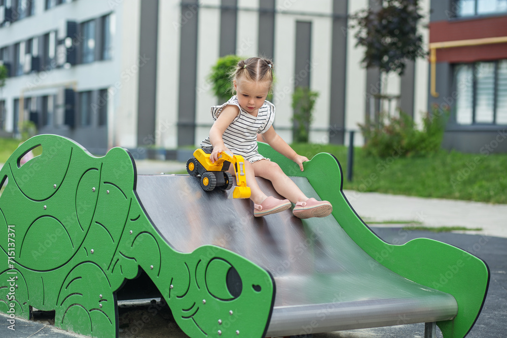 Excited Toddler with Toy on Playground Slide