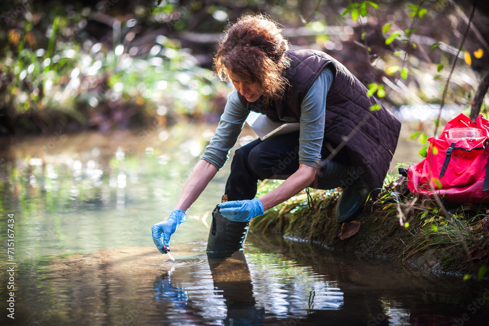Mid Adult Biologist Collecting Samples of Water for Further Examination from a Water Stream in Countryside