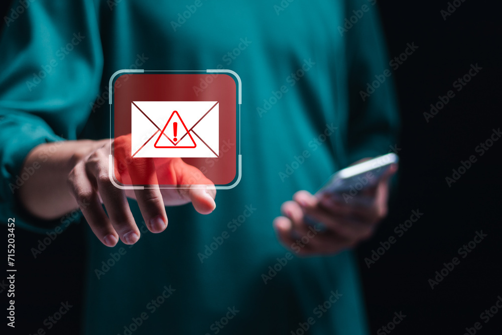 Email Spam concept. Person holding a smartphone displaying Email spam icon, junk and e-marketing, Alert Email spam virus with warning caution for notification on internet letter security protect