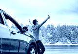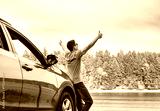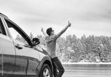 Young man traveler enjoying nature in mountain lake setting. Travel and active lifestyle concept.