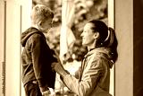 Happy mother getting her child son smiling getting dressed up putting sweater on. Good parenting childcare concept.