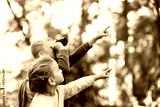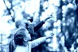 Children in the forest looking through binoculars exploring nature and wildlife