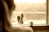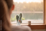person relaxing at home in the morning feet up, warm socks, looking out her window at the beautiful nature view feeling at peace calm