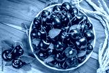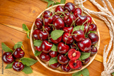 Red Cherry in wooden plate on wooden background, Cherry fruit in wooden basket on wooden table.