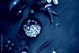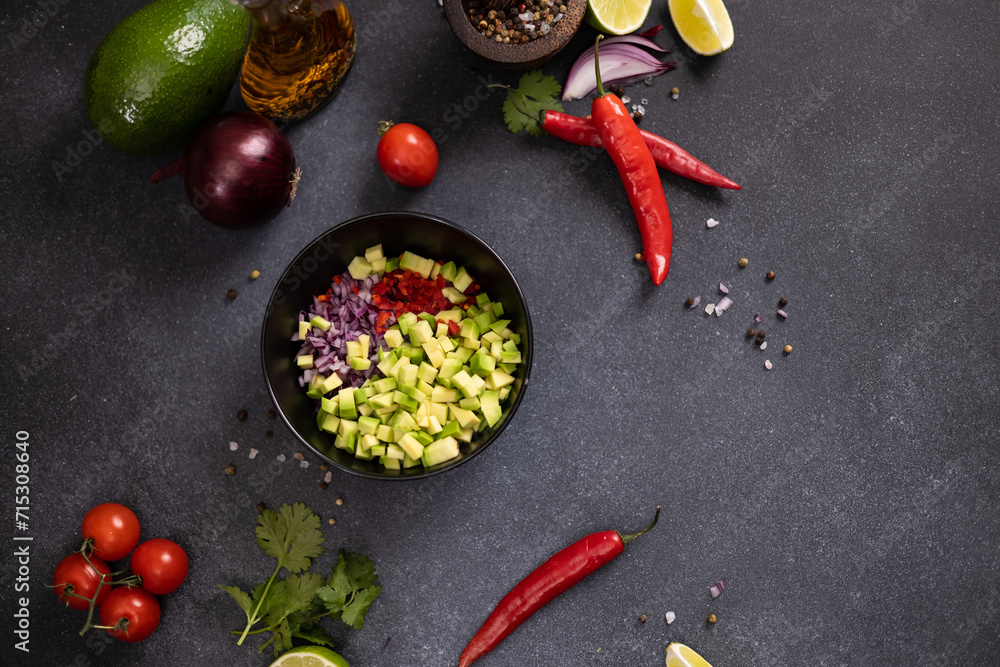 Cooking mango salsa - sliced chopped ingredients in a black ceramic bowl