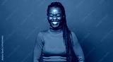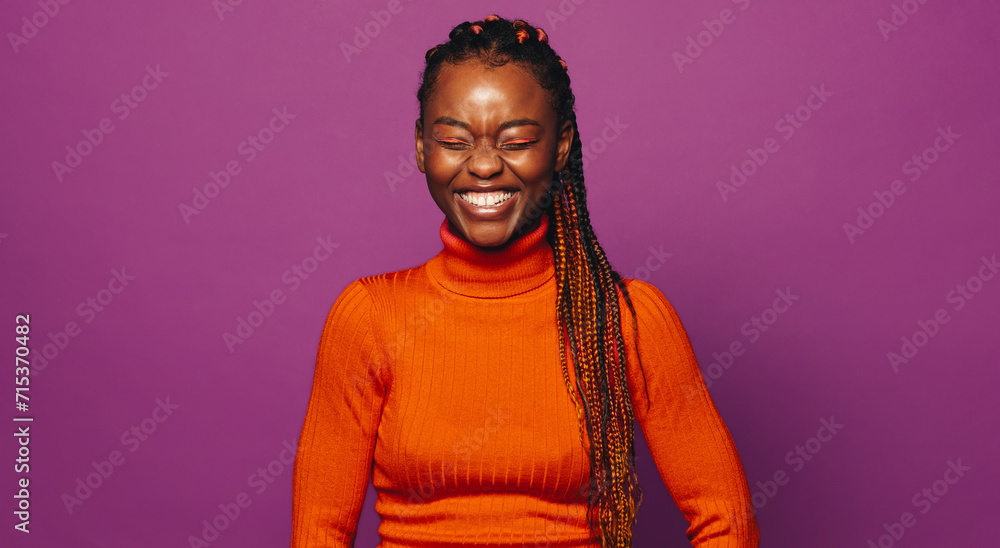 Confident black woman with purple background, stylish two tone braids and colorful makeup