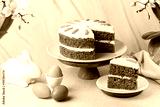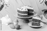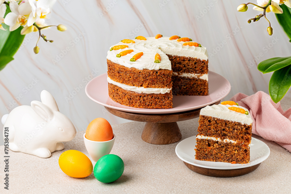 Easter table with carrot cake, Easter colorful eggs and bunny. Holiday homemade food, light background.