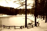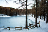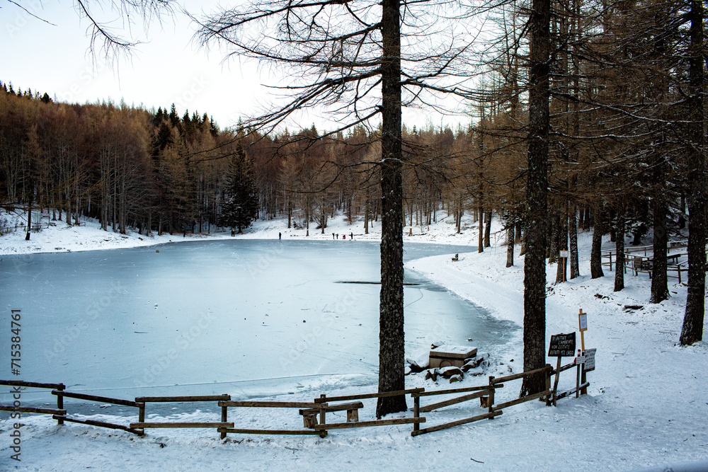 Winter mountain iced lake Il Lago della Ninfa. Monte Cimone, mountains in the northern Apennines, of Italy, Emilia-Romagna. Eco Sigh where is written about preservation of the lake and security.