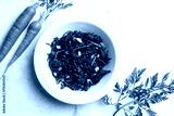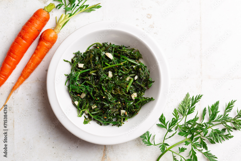 Sauteed carrot tops or greens with garlic and red pepper. Zero waste food concept. Top view.