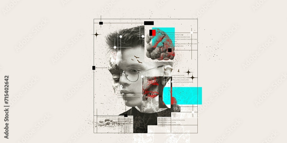 Book cover for young adult fiction exploring themes of intelligence and identity. Portrait of young made mixed with various images of face, brain. Neuroscience. Psychology, surrealism art concept
