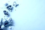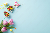 Springtime Sweetness Display: Top view of amusing gingerbread, chocolate eggs, candies, and sugar sprinkles on a light blue background with space for your message