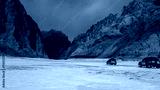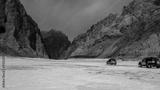 High-altitude frozen lake, lake in ice, lake of ice, Kyrgyzstan, Kyrgyzstan and car on the ice