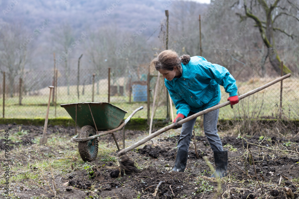 Adult Woman Doing Farmer's Preparatory Work in Garden in Winter