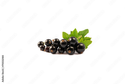 Blackcurrant branch isolated on white background. Currant sprig on white. Black currant isolated on white background. Ripe and tasty currant.