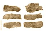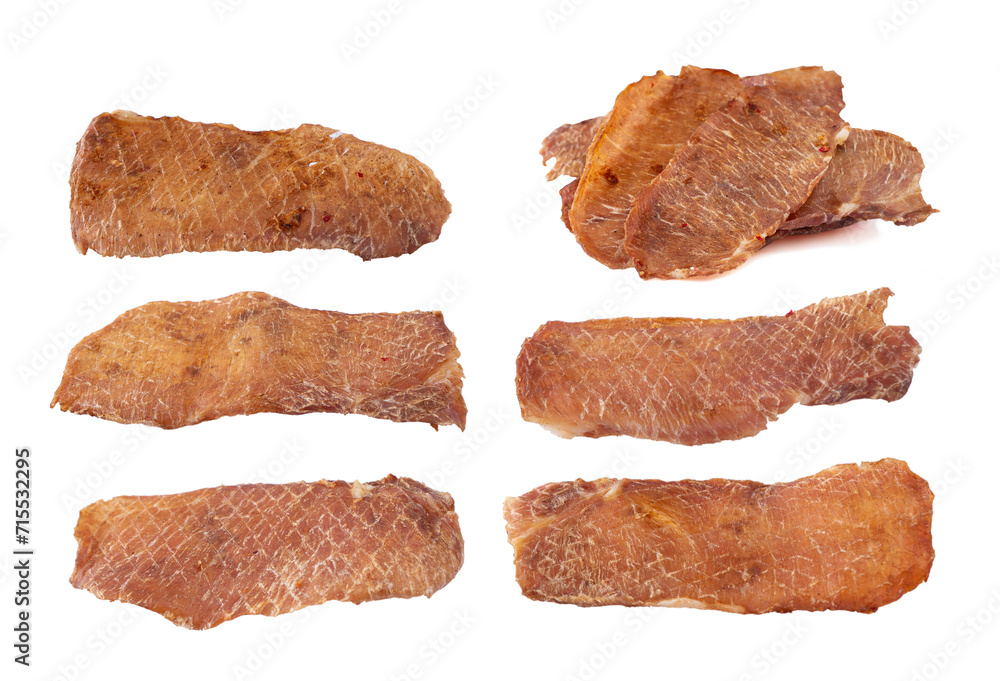Set og jerky isolate. Pieces of cured pork isolated on white background. Portion of dried pork on white background. Dried pork isolated on white background. Pieces of dry meat.
