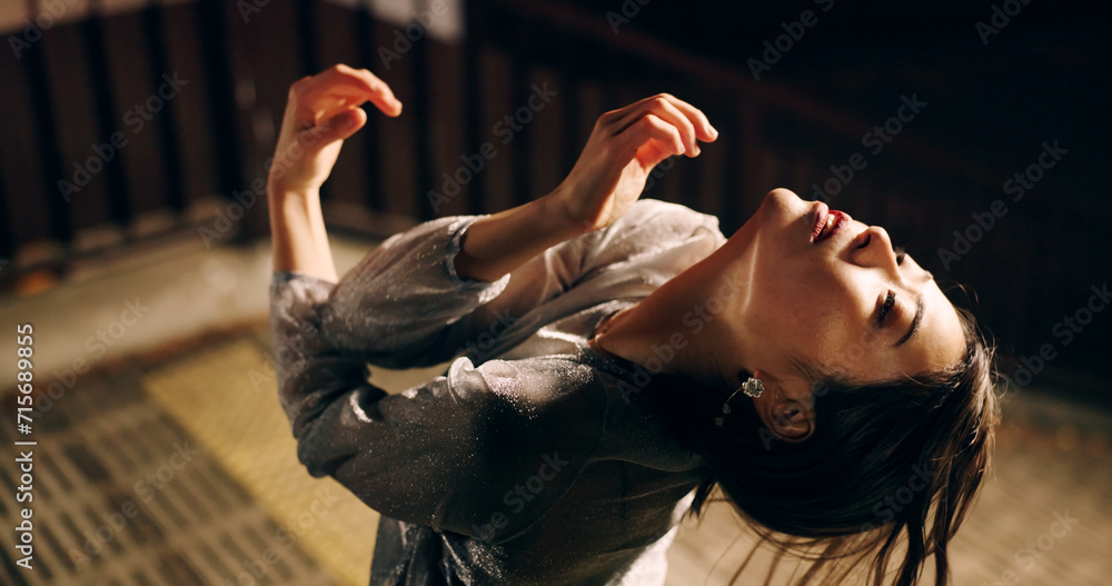 Woman, dancing and street performance at night in Japan for contemporary, outdoor or dark. Asian person, creative and art in urban city or Tokyo metro for music expression, entertainment or confident