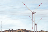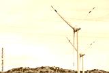 View of wind farm with high wind turbines for generation electricity