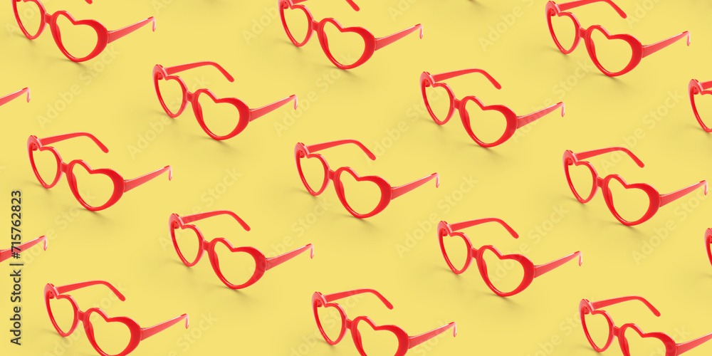 Pattern made with red heart shaped sunglasses on pastel color background