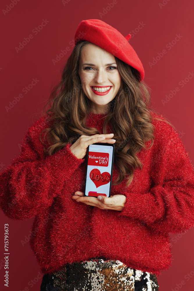 smiling woman with long wavy hair, smartphone and Valentine app