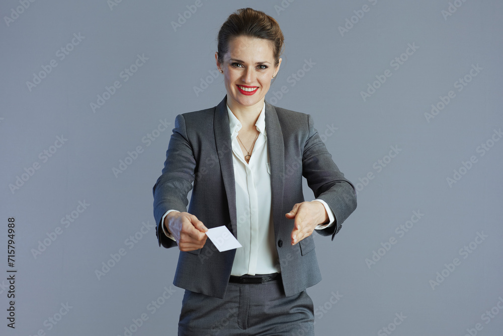 happy young woman worker in grey suit isolated on gray