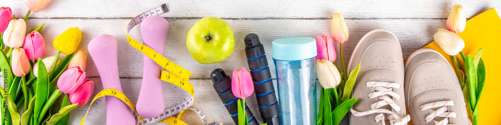 Spring sport fitness background. Outdoors springtime workouts concept. Running sneakers, dumbbell, jump rope, water bottle, tape measure, spring tulip flower, wooden background top view copy space