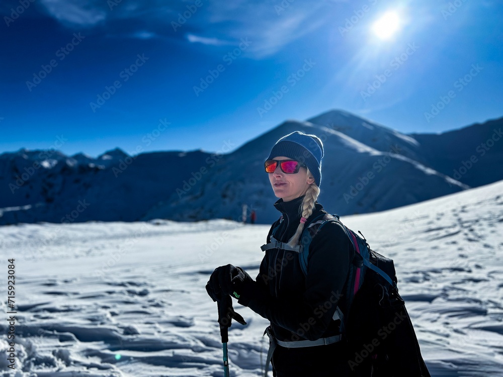 Winter trekker pausing in the serene expanse of the Polish Tatras, under the morning sun