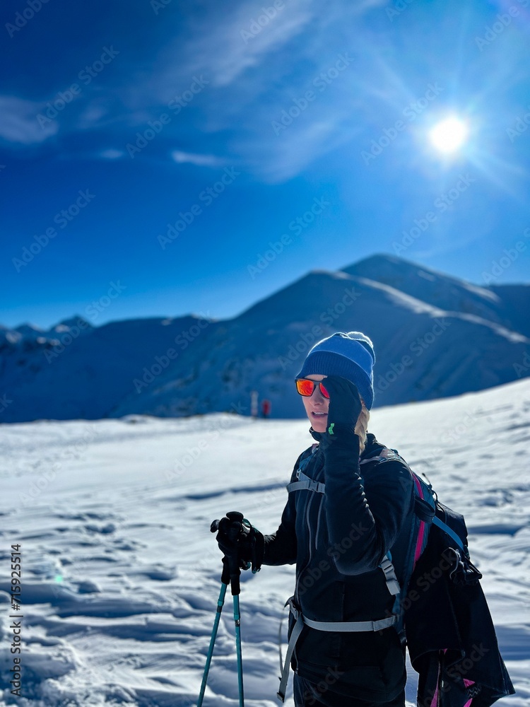 Winter trekker pausing in the serene expanse of the Polish Tatras, under the morning sun