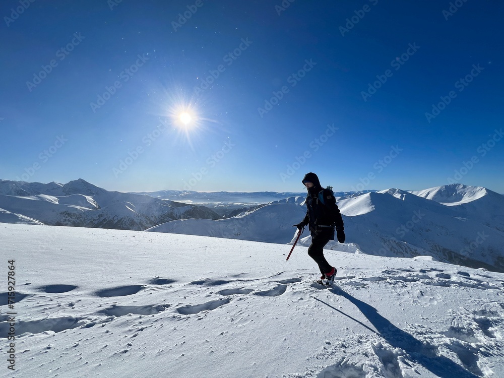 Adventurer conquering the frosty slopes of the Polish Tatras, sun blazing above