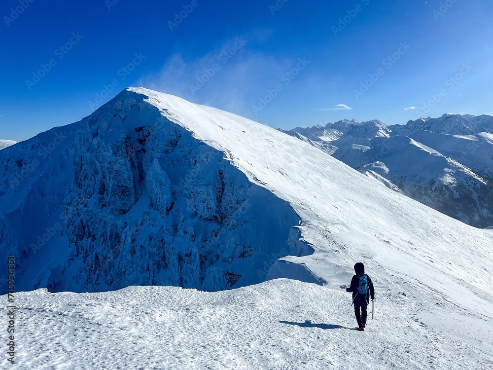 Hiker's winter journey across the snowy ridges of the Polish Tatras under the clear sky.