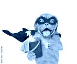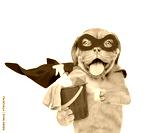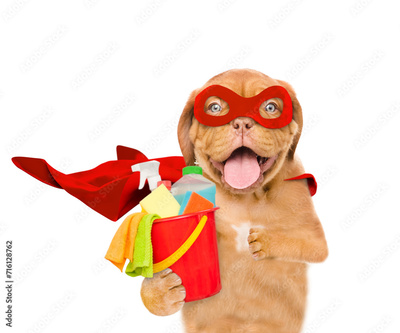 Funny Mastiff puppy wearing superhero costume holds bucket with washing fluids. Isolated on white background